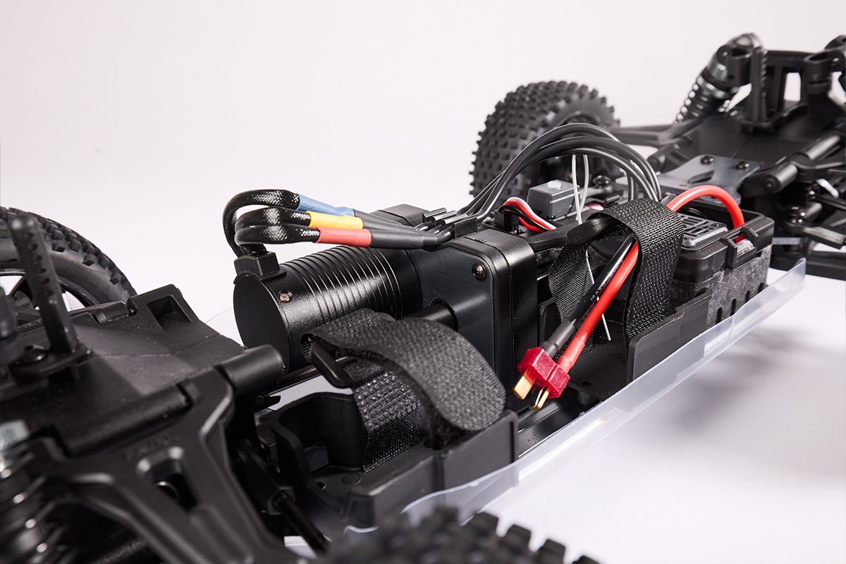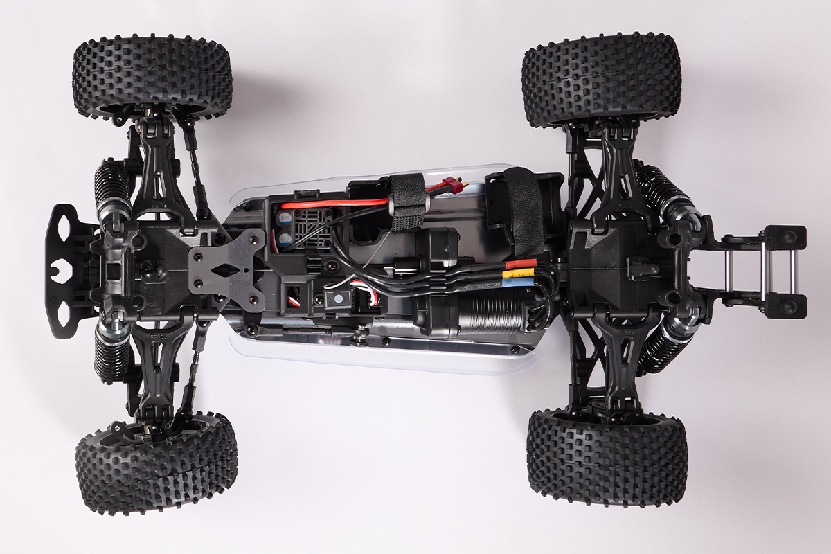 Robuste Konstruktion für härteste Bedingungen Der BEAST BX ist so gebaut, dass er auch widrigsten Bedingungen standhält. Die extrem belastbare Aluminium Bodenplatte bietet außergewöhnliche Stabilität und schützt das Fahrzeug vor Beschädigungen. Die einstellbare Einzelradaufhängung und die Öldruckstoßdämpfer ermöglichen ein individuelles Setup für beste Traktion und Kontrolle – ob auf steinigem Untergrund, Sand oder glatten Straßen. Mit den High Grip Spike Reifen bleibt der Buggy dabei in Kurven oder auf rutschigen Flächen sicher auf der Strecke.