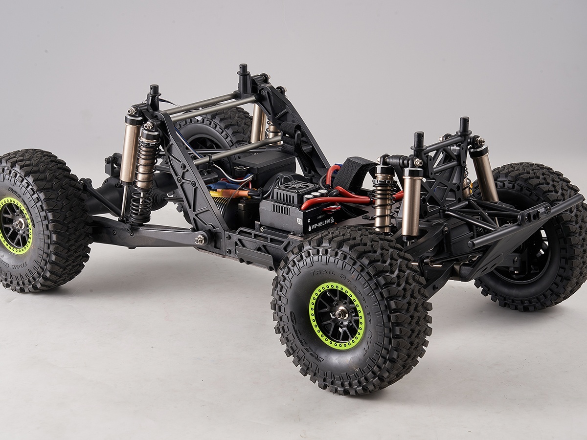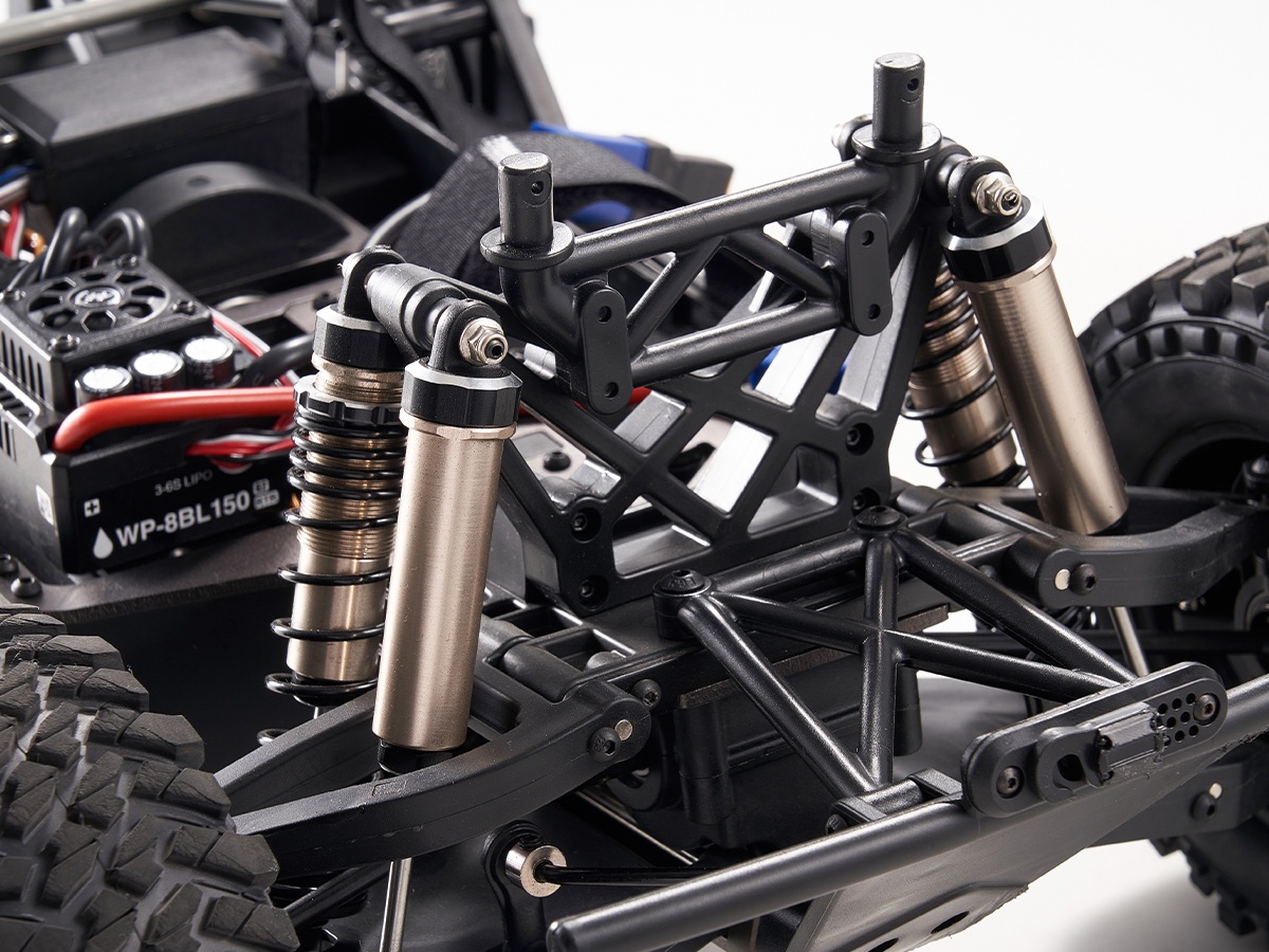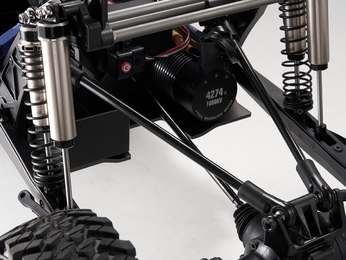 Robustes Chassis für härteste Einsätze Im Herzen des Broncos steckt ein CNC-gefrästes Aluminium-Chassis, das nicht nur maximale Stabilität, sondern auch ideale Gewichtsverteilung für den Offroad-Einsatz bietet. Die Unterseite wird durch eine Metallplatte geschützt, die Einschläge abdämpft und empfindliche Komponenten bei Sprüngen und rauem Gelände schützt. Das Chassis-Layout ist optimiert für eine ausgewogene Balance zwischen Geschwindigkeit, Traktion und Wendigkeit.