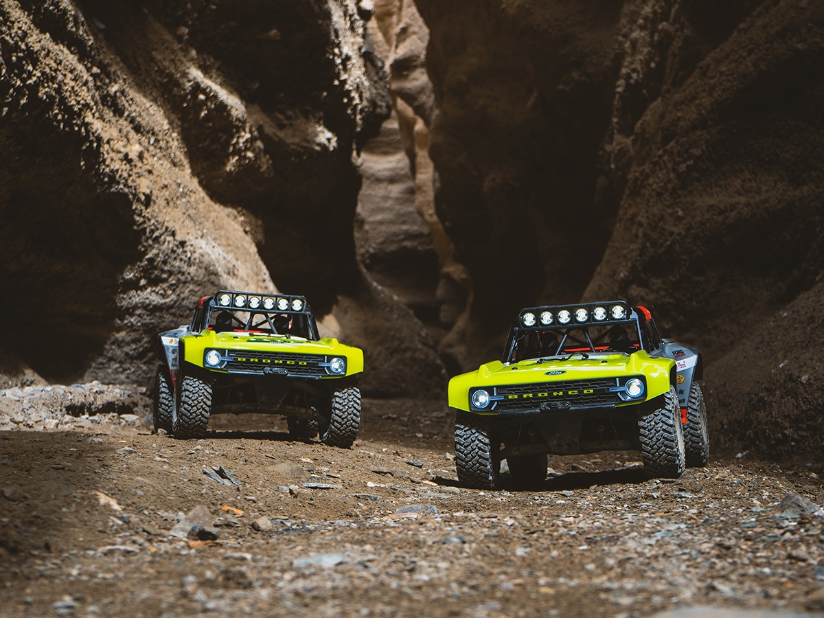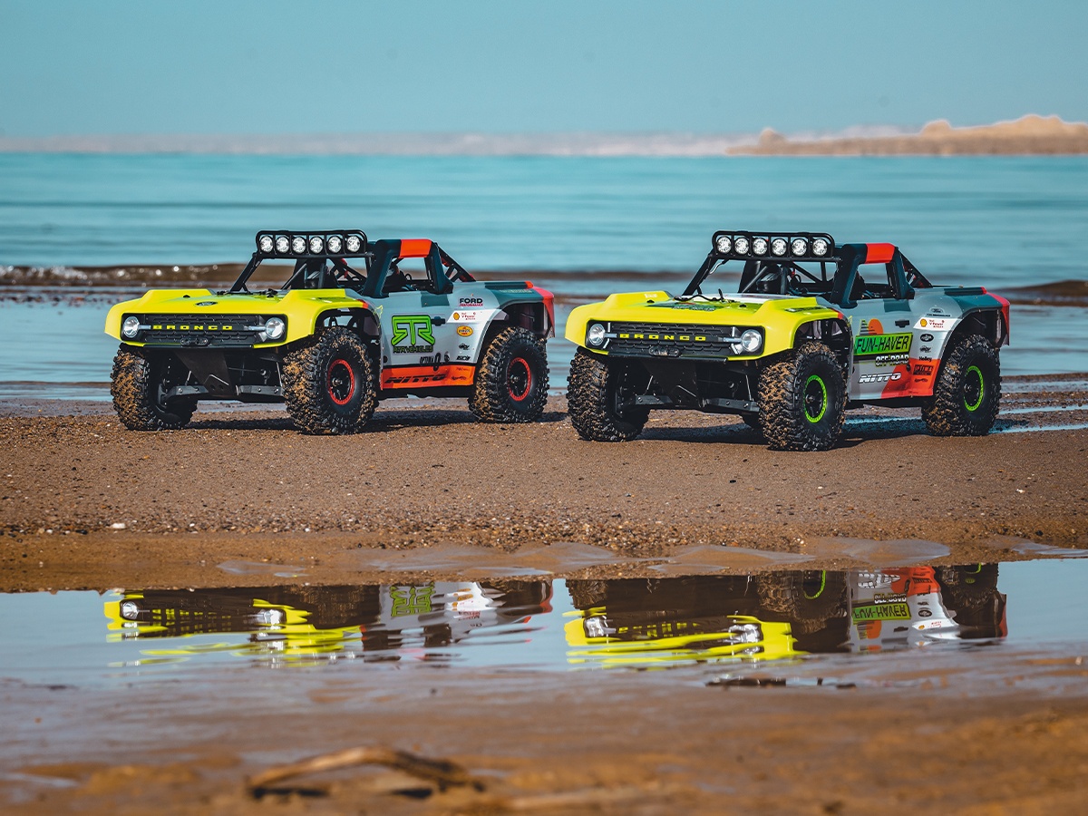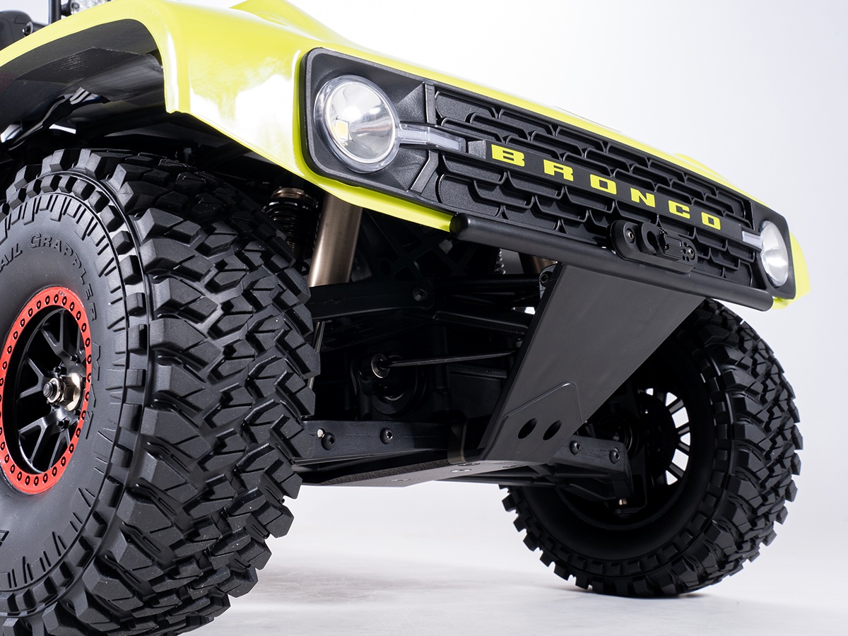 Große Kotflügelverbreiterungen, ein robuster Überrollkäfig, detailliertes Interieur, LED-Beleuchtung und maßstabsgerechte Außenspiegel machen diesen Bronco zu einem der realistischsten Modelle seiner Klasse. Dank der massiven Nitto Trail Grappler Reifen auf Beadlock-Felgen steht auch das Fahrverhalten seinem Vorbild in nichts nach.