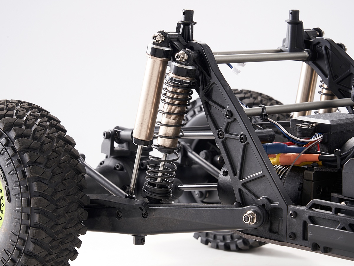 Hochwertige Federung für maximale Kontrolle Der FMS Bronco ist mit acht großvolumigen, ölgedämpften Aluminium-Stoßdämpfern ausgestattet. Diese garantieren hervorragende Dämpfungseigenschaften, selbst bei harten Landungen oder unwegsamem Gelände. Die Einzelradaufhängung vorne sowie die robuste, starre Hinterachse sorgen für ein ausgeglichenes, vorhersehbares Fahrverhalten, das sowohl Einsteiger als auch Profis überzeugt.