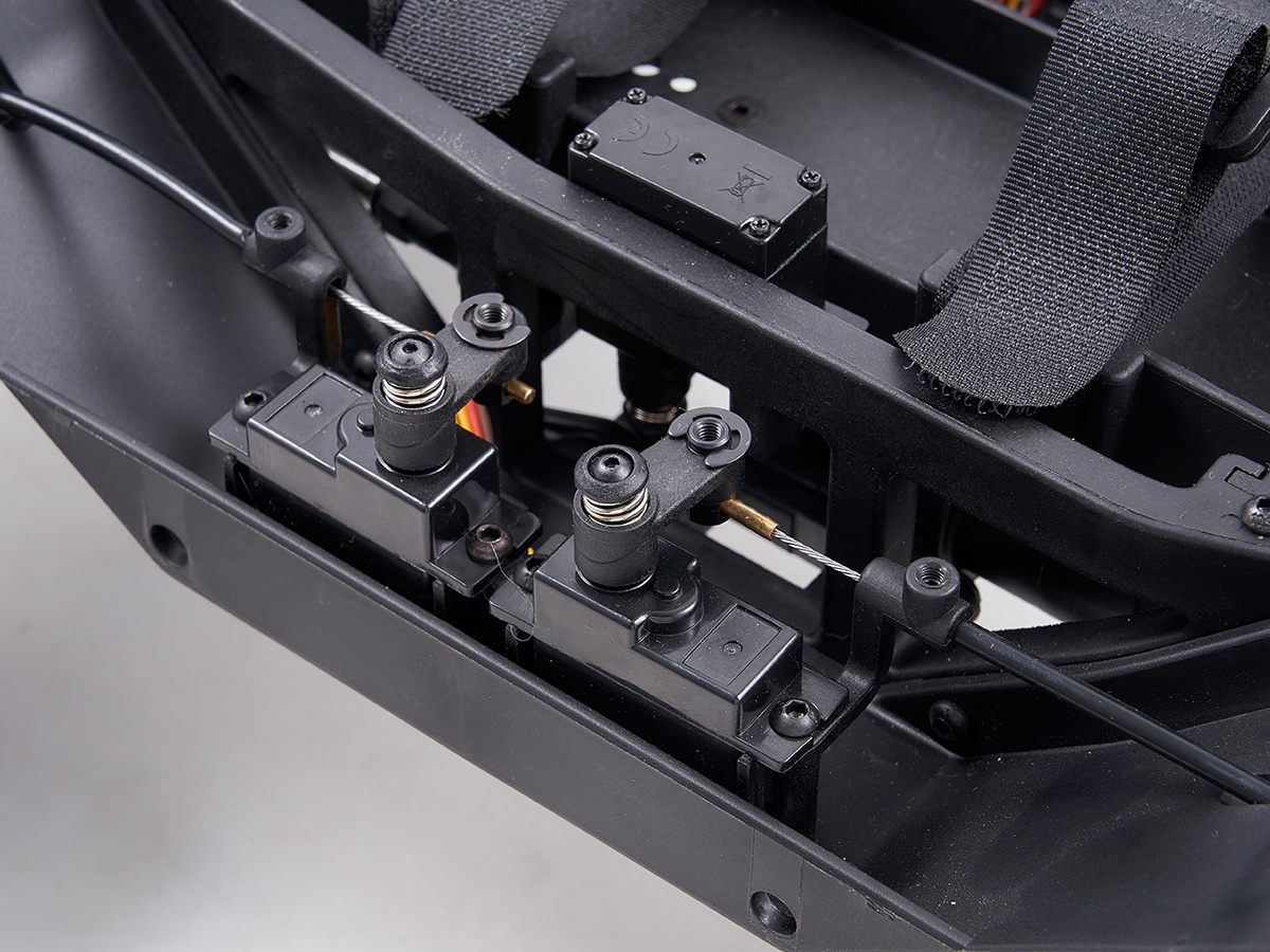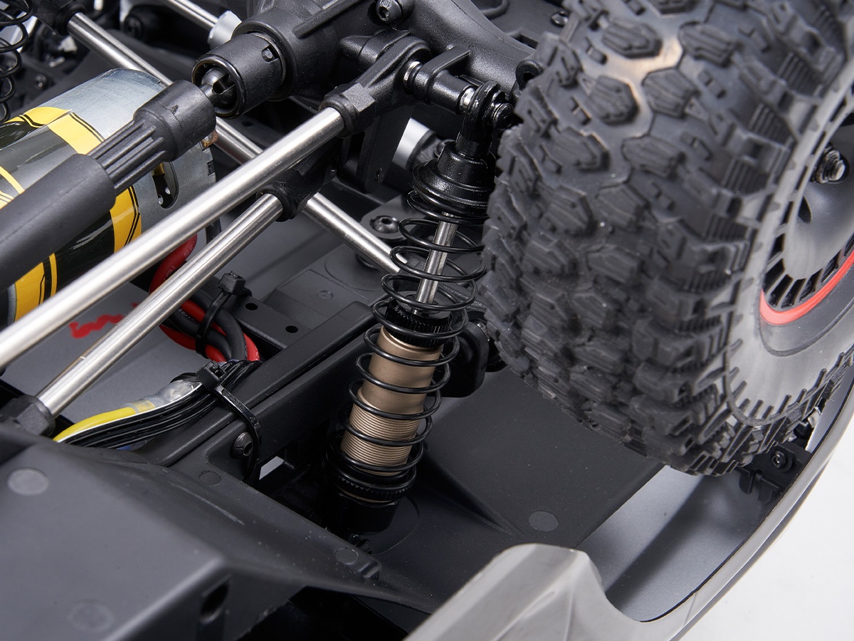 Fahrkomfort & Belastbarkeit Ein hochwertiges, vollständig kugelgelagertes Fahrwerk mit ölgefüllten Stoßdämpfern aus Metall sorgt für optimale Bodenhaftung in jeder Situation. Dank gegenläufig rotierender Kardanwellen werden Drehmomenteffekte minimiert, was die Lenkpräzision und Fahrstabilität weiter verbessert. Für zusätzliche Sicherheit ist der Lenkservo durch einen cleveren Stoßschutz mechanisch entkoppelt. Selbst bei harten Einschlägen bleibt das empfindliche Servo geschützt.