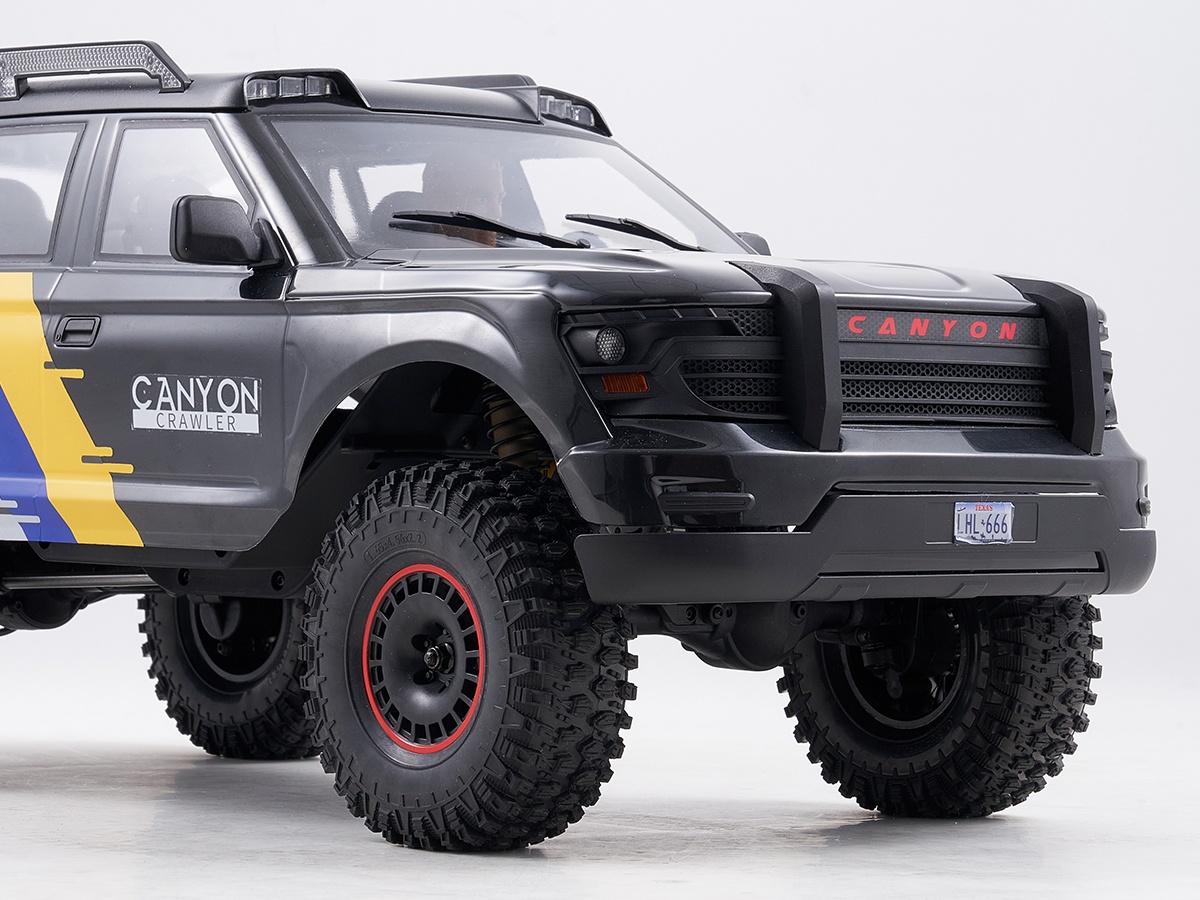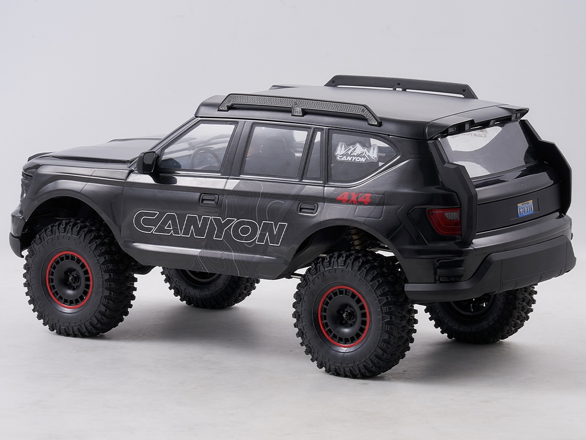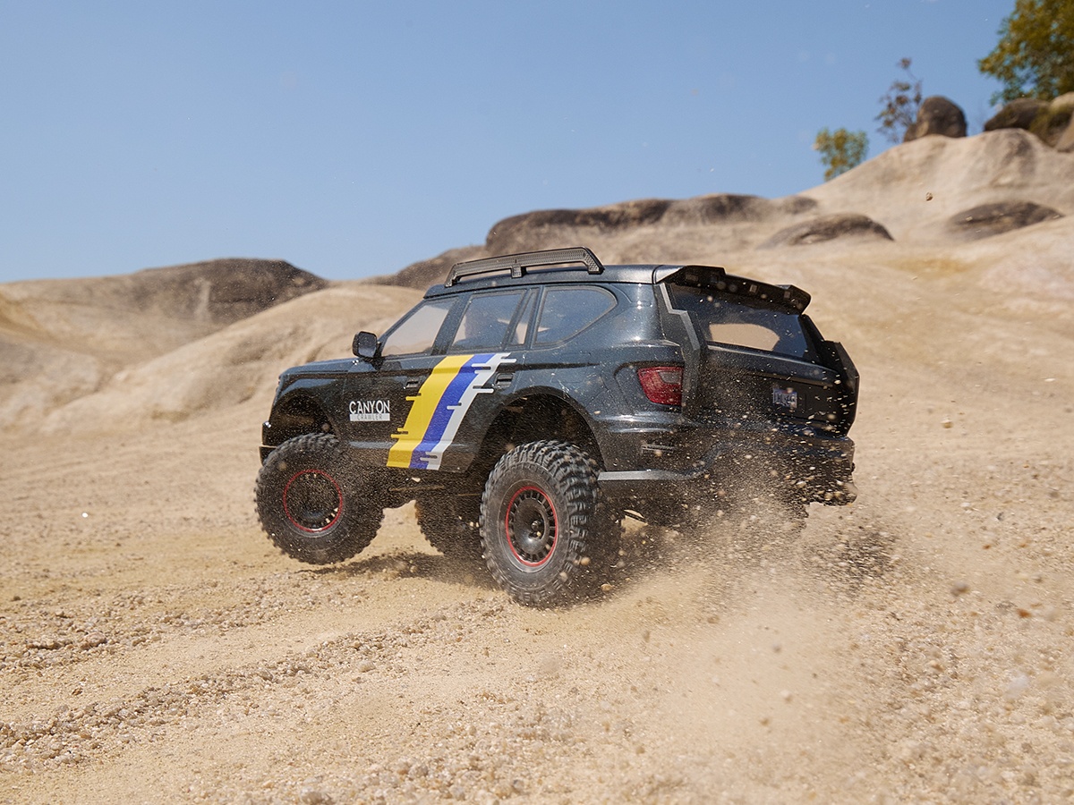 Fahrwerk & Antrieb: Für technische Trails gemacht Der Antrieb erfolgt über eine kräftige 550er Brushed-Motor (32T) Einheit. Zwei per Fernsteuerung schaltbare Gänge sorgen für eine ausgewogene Kombination aus Drehmoment (Low Gear) und Geschwindigkeit (High Gear). Zusätzlich verfügt der Canyon über ein mittiges Verteilergetriebe mit Rückwärtsgang - sehr selten in dieser Fahrzeugklasse. Für maximale Geländegängigkeit ist der Canyon mit einem DIG-System ausgestattet: Hierbei kann eine Hinterachse blockiert werden, um besonders enge Wendemanöver (ähnlich wie bei Kettenfahrzeugen) auszuführen - ideal auf technischer Strecke. Ein weiteres Feature ist der per Fernsteuerung sperrbare Vorder- und Hinterachsdifferentiale, was den Canyon besonders vielseitig macht - ob als Trailtruck oder als Competition-Crawler.