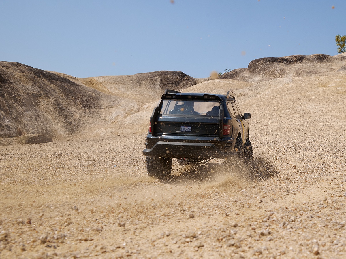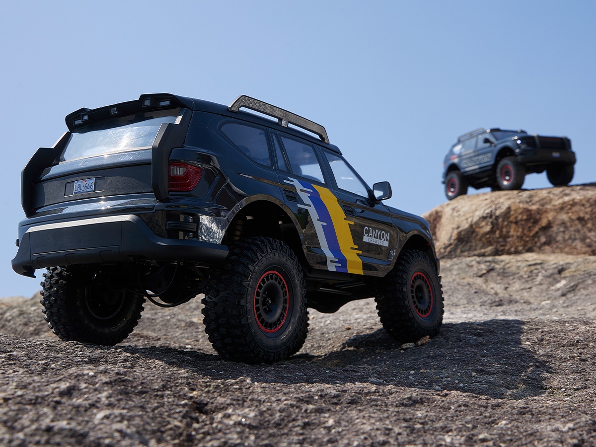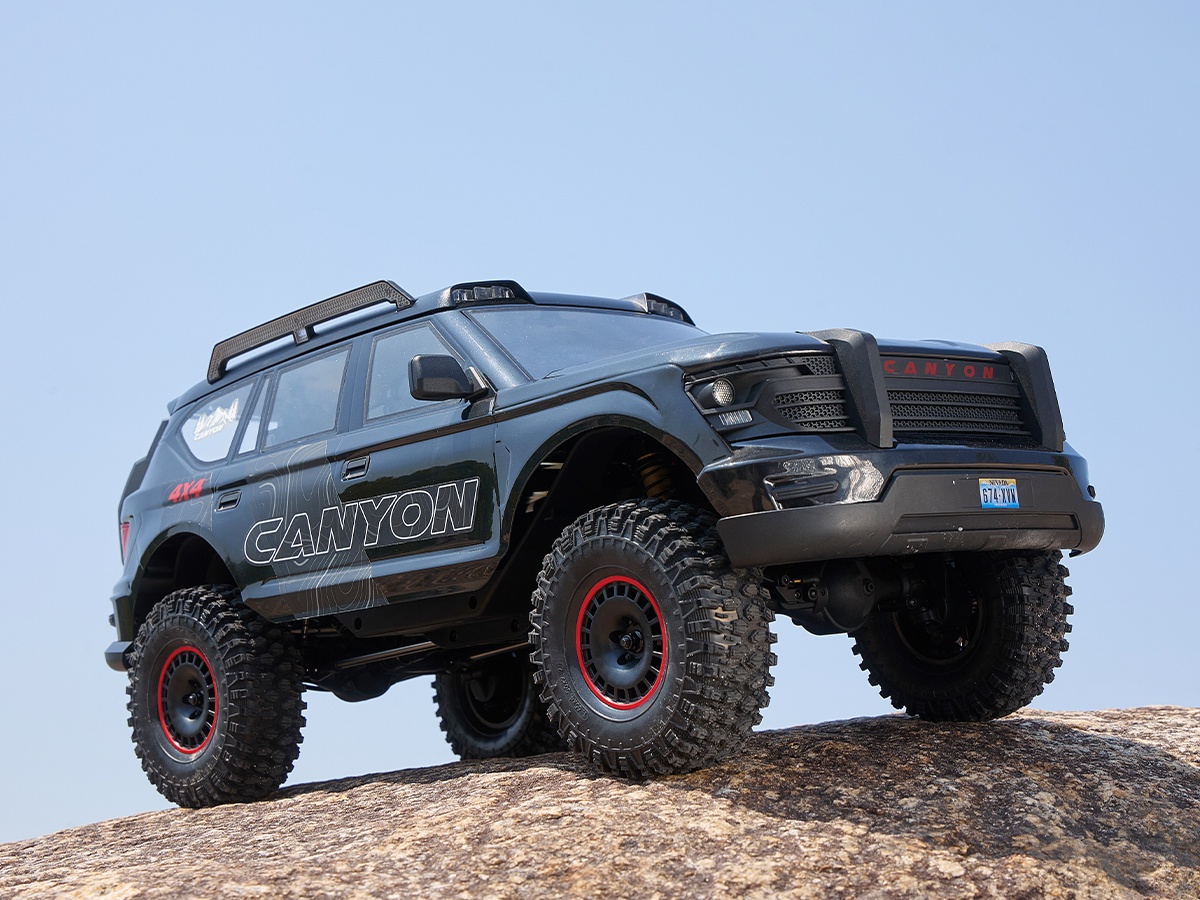 Fahrwerk & Antrieb: Für technische Trails gemacht Der Antrieb erfolgt über eine kräftige 550er Brushed-Motor (32T) Einheit. Zwei per Fernsteuerung schaltbare Gänge sorgen für eine ausgewogene Kombination aus Drehmoment (Low Gear) und Geschwindigkeit (High Gear). Zusätzlich verfügt der Canyon über ein mittiges Verteilergetriebe mit Rückwärtsgang - sehr selten in dieser Fahrzeugklasse. Für maximale Geländegängigkeit ist der Canyon mit einem DIG-System ausgestattet: Hierbei kann eine Hinterachse blockiert werden, um besonders enge Wendemanöver (ähnlich wie bei Kettenfahrzeugen) auszuführen - ideal auf technischer Strecke. Ein weiteres Feature ist der per Fernsteuerung sperrbare Vorder- und Hinterachsdifferentiale, was den Canyon besonders vielseitig macht - ob als Trailtruck oder als Competition-Crawler.