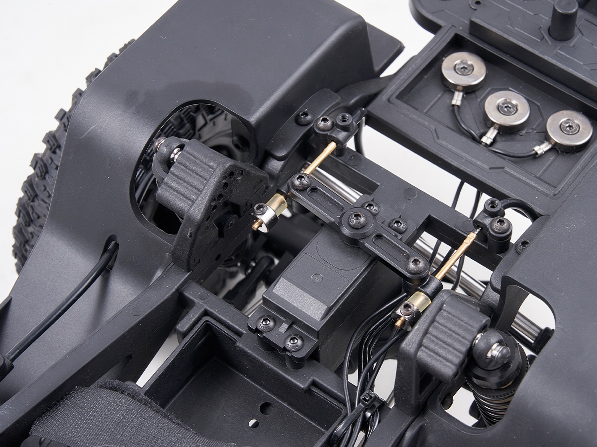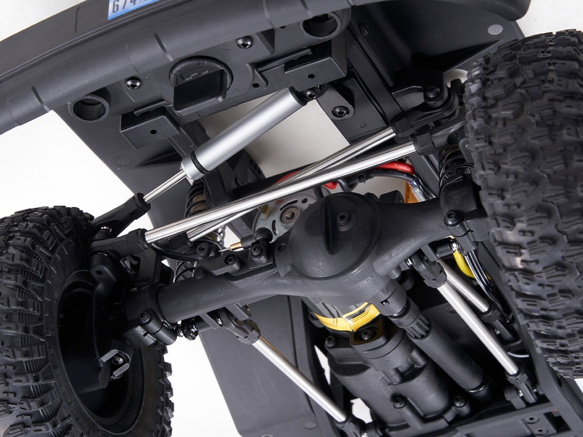 Robustes Chassis mit cleverer Technik Das komplett neu entwickelte LCG-Chassis (Low Center of Gravity) aus verstärktem Nylon bietet eine besonders niedrige Schwerpunktlage - perfekt für schwierige Passagen und steiles Gelände. Die modulare Rahmenbauweise mit Zapfenverbindungen (Tenon & Mortise) sorgt für maximale Stabilität und einfache Wartung. Ein weiteres Highlight: Die portalen Achsen an Vorder- und Hinterachse erhöhen die Bodenfreiheit erheblich und reduzieren gleichzeitig die Belastung der Antriebskomponenten.