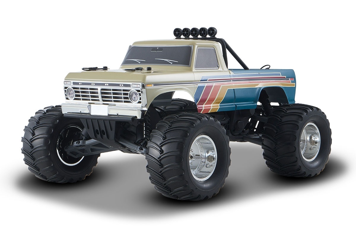 Eigenschaften: • Offiziell lizenzierter Ford F100 Monster Truck • Detailgetreue PC-Karosserie mit Scale-Dekoren • Leistungsstarker Brushless-Motor & 60A Regler • 2WD Hinterradantrieb • Massive Offroad-Monster-Truck-Reifen • Einstellbarer Wheelie-Bar • Zentrales Akkufach mit Schnellverschluss • Kugelgelagerter Antriebsstrang • Spritzwassergeschützte Elektronik • 15 kg wasserdichtes Digital-Lenkservo • 2,4 GHz Fernsteuerung mit Einsteigermodus