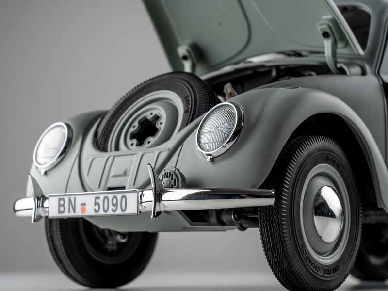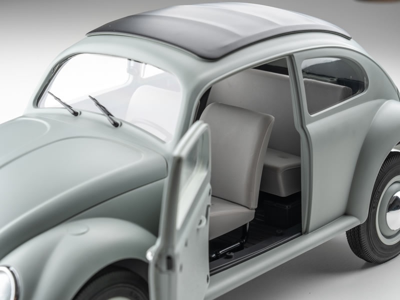 Äußere Werte • widerstandsfähige Polystrol-Karosserie fertig lackiert • vorbildgetreue Räder und Reifen • abnehmbares Dach • aufklappbare Kofferraumklappe vorne, darunter funktionsfähiges Reserverad • aufklappbare Motorhaube hinten, darunter Attrappe des Vierzylindermotors mit Kühlgebläse mit Riemenantrieb • Seitentüren lassen sich öffnen und schließen mit federbelasteter Verriegelung • realistische Softgummi-Sitze – ideal für Figuren im Maßstab 1:12 • zahlreiche Scale Details für eine realistische Optik • detaillierter Innenraum und Armaturenbrett • funktionale Beleuchtung kann an Fernsteuerung aktiviert werden