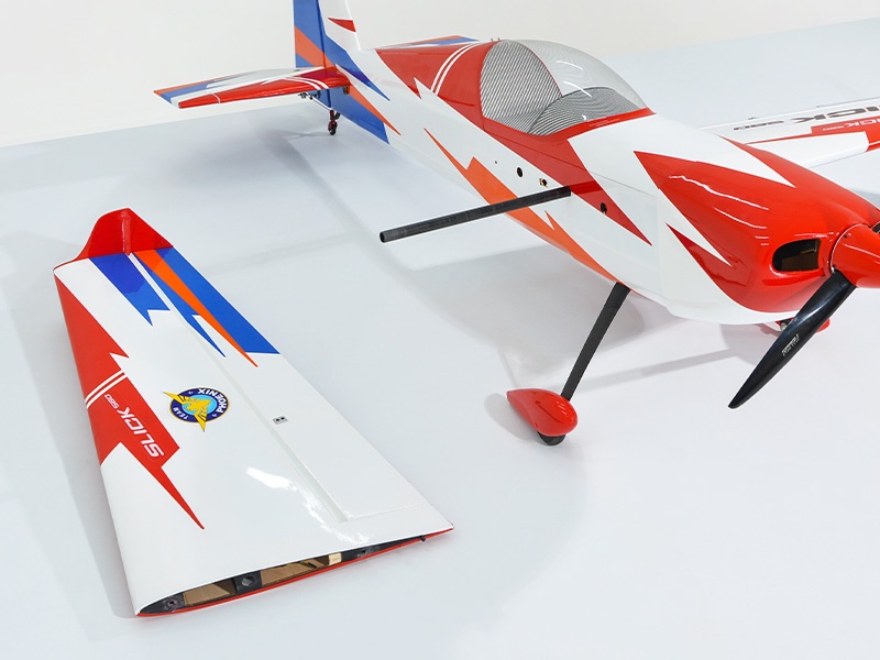 Holz/Carbon-Konstruktion mit enorm hohen Vorfertigungsgrad Das Modell ist in extrem leichter und verstärkter Holz- und Carbonbauweise gefertigt. Die lasergeschnittene Struktur sorgt für maximale Festigkeit bei minimalem Gewicht. Der hohe Vorfertigungsgrad reduziert den Bauaufwand nahezu auf den Einbau von Antrieb und Elektronik. Unter der großen, abnehmbaren Kabinenhaube befindet sich reichlich Platz für Elektronik, Akku oder Tank. Die Slick ist komplett mit Folie bespannt und besitzt eine lackierte GfK-Motorhaube.